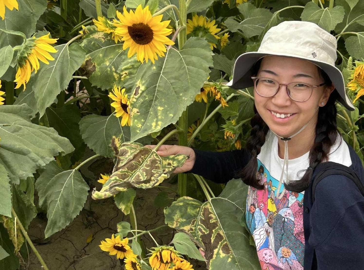 Yue Yu in a sunflower field during the International Sunflower Conference field trip day in Wuyuan County, Inner Mongolia, China. Photo from personal archives.